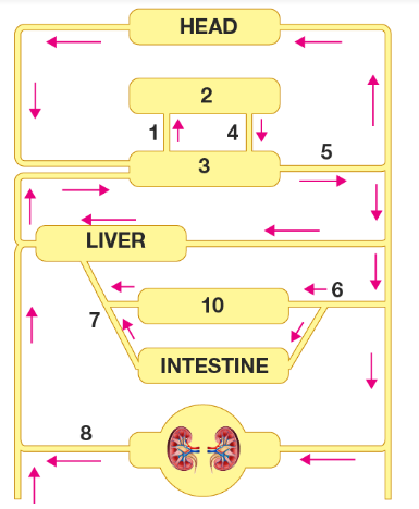 4. The following simplified diagram refers to the outline plan of the circulation of blood in a mammal. Study the diagram and write the number and name of the blood vessel in each case as mentioned ahead.