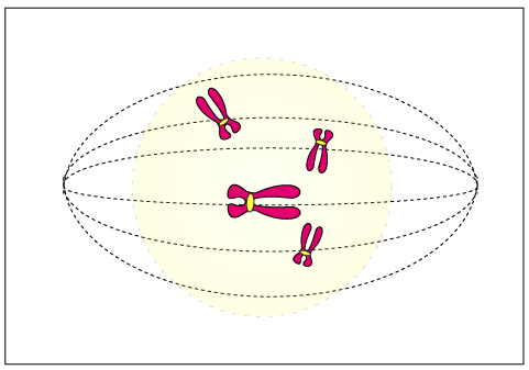 It is identified by the centromere of chromosomes are drawn to the equator by the equal pull of two chromosomal spindle fibres that connect each centromere to the opposite poles, forming a metaphasic plate.