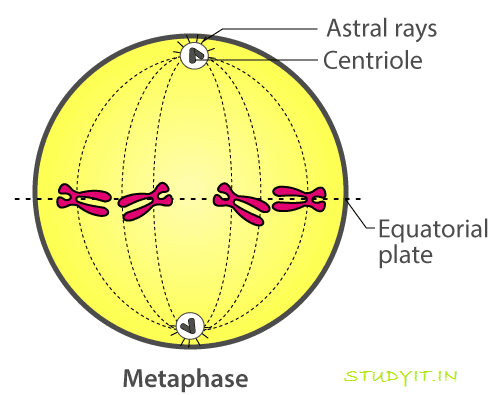 Metaphase:- The duplicate chromosomes arrange on the equatorial plane. Each chromosome gets attached to a spindle by its centromere.