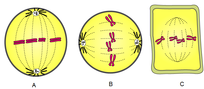 7. Given below are three diagrammatic sketches (A, B and C) of one and the same particular phase during mitotic type of cell division.
