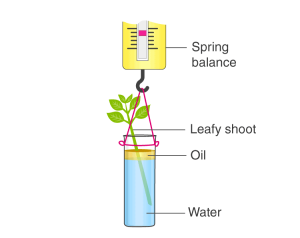 The purpose of the spring balance in the set-up is to measure the change in weight of the set-up. A small lightweight potted plant can be weighed before and after the end of a certain period of time. The soil surface and the pot should be fully covered to prevent evaporation from the surfaces other than the plant. The loss in weight by the plant during that time is due to loss of water by transpiration.