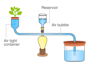 As transpiration proceeds, i.e., as the water is lost from the twig, a suction force is set up which pulls the water from the beaker and the bubble in the capillary tube moves along. The readings on the capillary tube would give the volume of water lost in a given time.
